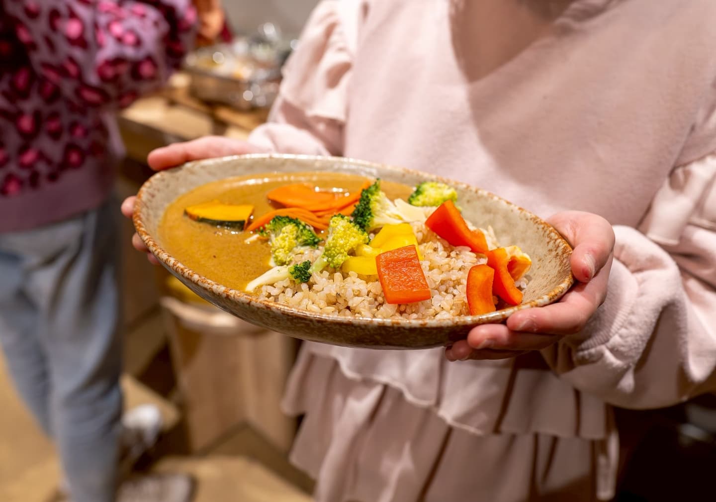 玄米ごはんと季節の野菜をたっぷり使ったカレーは、子どもたちが無理なく美味しく楽しめる優しい味。自ら盛り付けていただきます。